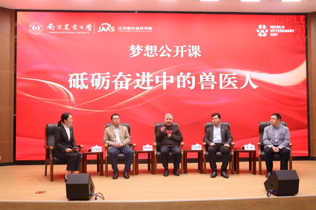 在《砥砺奋进中的兽医人》梦想公开课环节,动物医学院首任院长郑明球回顾了罗清生、祝寿康、韩正康、蔡宝祥等老一辈动医先贤的故事,回顾了学院雄厚的师资力量、一流的教材建设、丰硕的科研成果、优秀的校友资源,强调了优良校风、学风的重要性,勉励同学们踏踏实实、认认真真学习兽医科学技术,为解决、消灭动物疫病作出自己的贡献。江苏省农业科学院兽医研究所副所长冯志新、动物免疫工程研究所副所长王继春、学院预防兽医系系主任周斌,结合个人求学、工作经历,就当前兽医学科发展、人才培养等方面给出了建议。
