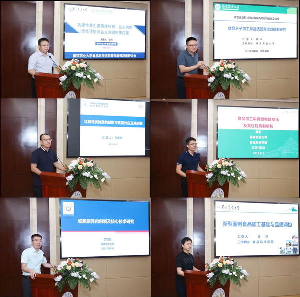 青年教师代表李伟副院长、胡冰教授、王虎虎教授、陶阳副教授、丁世杰副教授和王沛副教授分别就功能性益生菌菌库构建、益生功能活性评价及益生关键物质挖掘、食品分子加工与品质营养增效机制、冰鲜鸡优势菌的黏附与致腐、食品加工中典型物理变化及其过程机制、细胞培养肉创制及核心技术、新型面制食品加工基础与品质调控等进行了汇报。