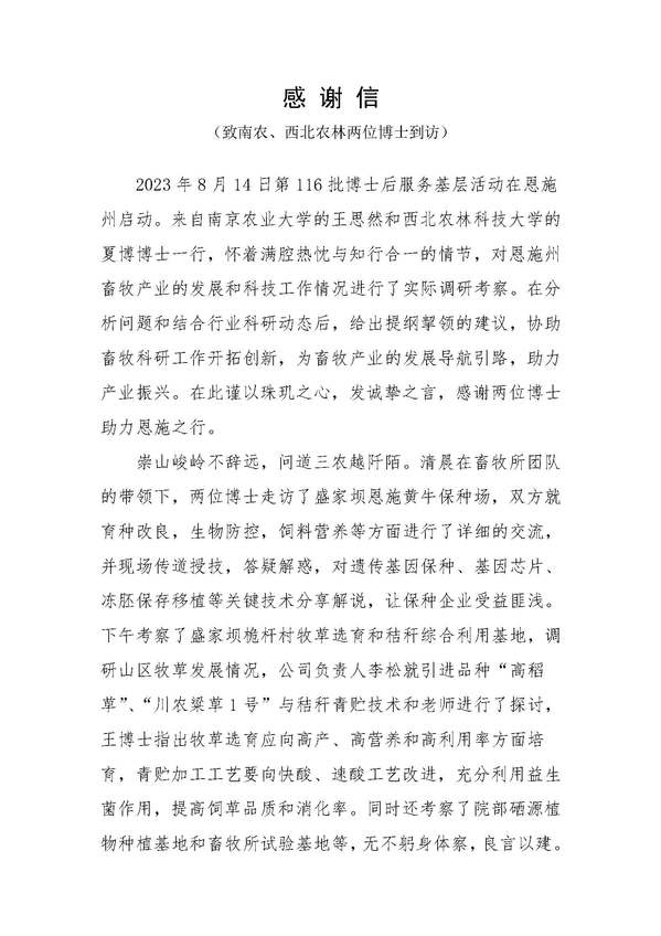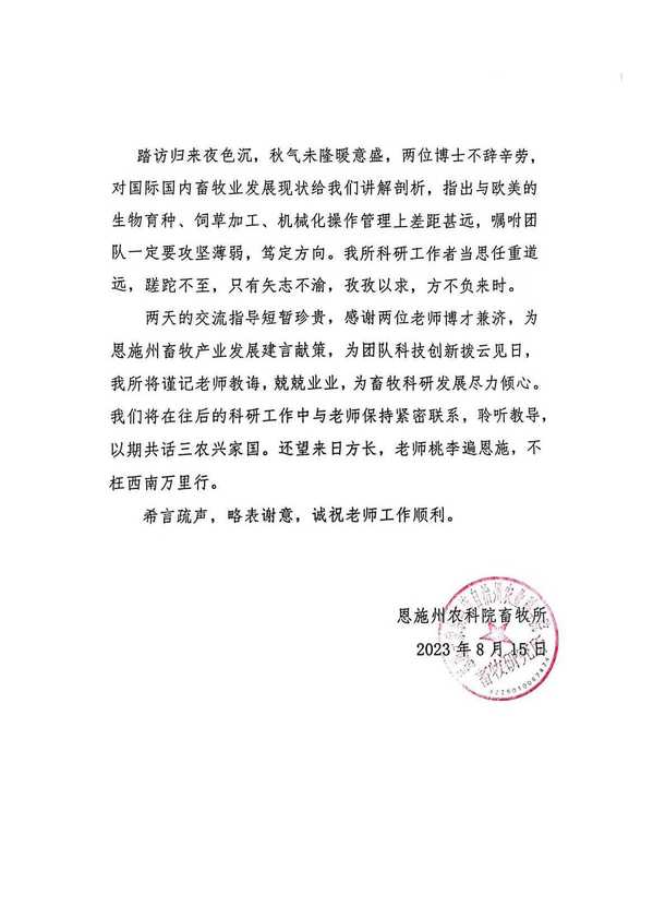 近日,恩施州农科院畜牧所向草业学院青年研究员王思然博士发来感谢信,感谢王思然博士为恩施州畜牧产生发展建言献策。