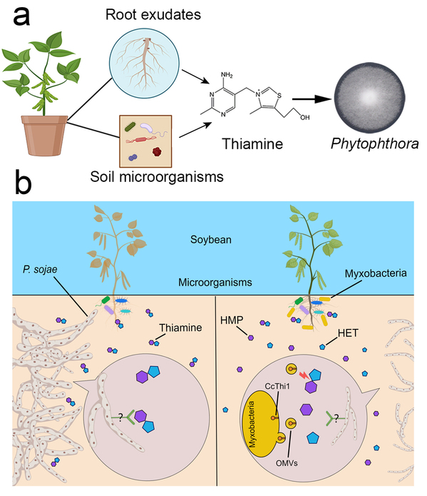 (a)土壤微生物和大豆能够为疫霉菌生长提供硫胺素;(b)黏细菌通过分泌硫胺素酶阻断疫霉菌获取硫胺素的路径抑制疫霉菌对植物的侵染