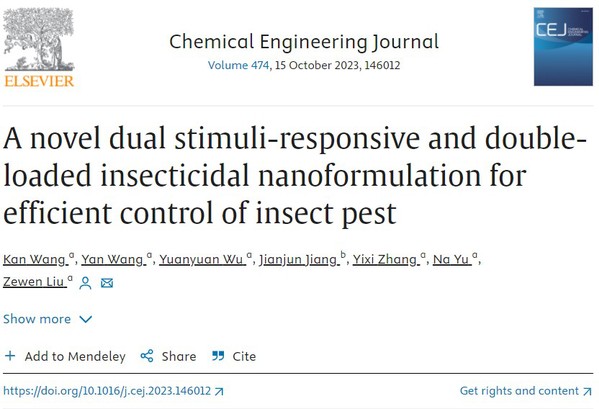 近日,ios版雷竞技官网植物保护学院刘泽文教授团队在Chemical Engineering Journal发表题为“A novel dual stimuli-responsive and double-loaded insecticidal nanoformulation for efficient control of insect pest”的论文,将双信号响应、农药双项负载和纳米技术结合,创制了一种新型、高效的双响应型双项负载纳米农药制剂用于害虫防治,为提高农药利用率和延缓害虫抗药性开辟新的途径。