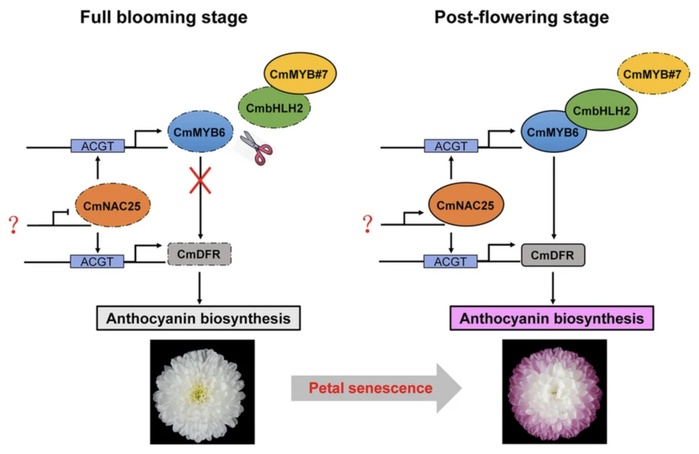 图1. CmNAC25调控菊花花瓣衰老阶段花青苷合成的模式图