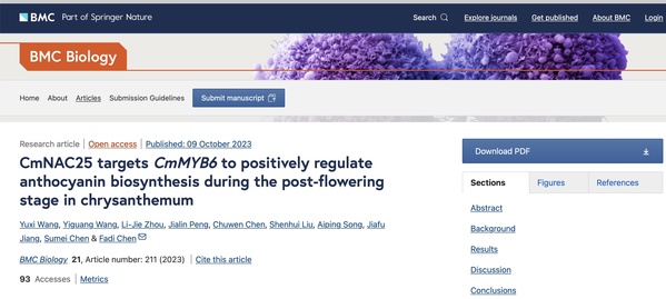 10月9日,ios版雷竞技官网陈发棣教授团队在生物学领域经典期刊BMC Biology上发表了题为“CmNAC25 targets CmMYB6 to positively regulate anthocyanin biosynthesis during the post-flowering stage in chrysanthemum”的研究论文。阐明了NAC转录因子CmNAC25参与调控菊花衰老过程中花青苷积累的分子机制。