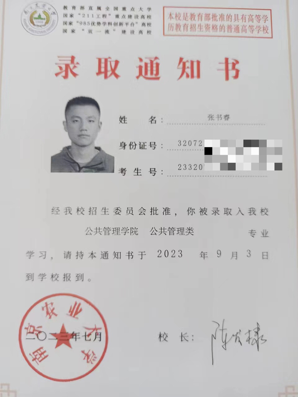 天高海阔万里长,华夏少年意气扬。从小受父亲潜移默化的影响,张书睿心中也种下了一颗南农的种子。“接下来我将好好学习,积极参加实践,希望未来能在南农公管院,续写父亲的旧故事,开创属于自己的新篇章。”他将从父亲手中接过“接力棒”,踔厉奋发,砥砺前行,开启属于自己的南农公管生涯!