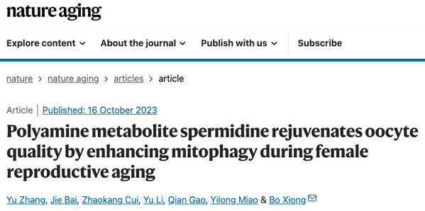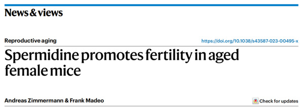 Nature Aging 期刊同期发表了来 奥地利格拉茨大学 Frank Madeo 等人的题为:Spermidine promotes fertility in aged female mice(亚精胺促进老年雌性小鼠的生育能力) 的“新闻与观点”文章。