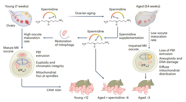 总而言之,这项发表在Nature Aging 期刊的论文表明,亚精胺对于老龄雌性小鼠维持正常生育能力至关重要,补充亚精胺水平可以恢复衰老卵母细胞的线粒体自噬,改善年龄相关性卵巢功能下降和生育力受损。这一研究结果为延长女性生育寿命开辟了新道路,为人类迫在眉睫的生育问题提供了一种解决方案。