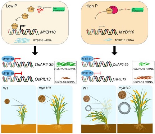 研究首先发现低磷胁迫和磷毒害均通过抑制水稻节间细胞的分裂以降低株高,继而筛选到一个受低磷胁迫诱导的水稻R2R3型MYB转录因子MYB110。该基因突变不影响磷素吸收和积累,却导致水稻株高显著增加且株高对低磷胁迫的响应减弱。进一步研究发现,MYB110是水稻磷信号转导网络核心调控因子OsPHR2的靶基因,受OsPHR2正调控并在其下游抑制水稻株高。有意思的是,myb110突变体虽然株高增加、茎秆木质素含量降低,但由于其茎秆相对野生型植株更为粗壮,因而具有更强的抗倒伏性。此外,myb110突变体在田间正常施肥和减施磷肥条件下均能通过提高每穗粒数和籽粒大小而增加产量。另一方面,MYB110存在两种主要的单倍型,其中单倍型1主要存在于籼稻,单倍型2主要存在于粳稻;虽两种单倍型都受低磷胁迫诱导,但单倍型1的表达量在对照和低磷条件下均显著低于单倍型2,并赋予水稻更高的株高。