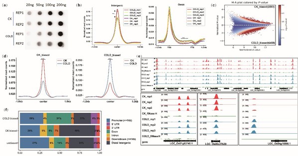 课题组通过结合DRIP-seq(DNA:RNA杂交免疫沉淀测序)技术以及RNA-seq、DNase-seq和ChIP-seq等多种组学数据,详细阐述了在水稻冷胁迫应答过程中,R-loop的动态变化及其调控功能。该研究发现,冷胁迫可引起水稻基因组中R-loop重编程(图一),且与冷胁迫有关的R-loop含有一些转录因子特异结合的基序。