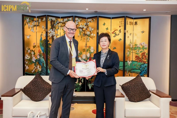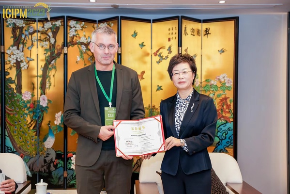 朱艳为Markus颁发客座教授荣誉证书。Markus简要介绍了他的研究工作,表示目前双方已经在合作研究,希望未来在农业害虫防治方面做出更多的贡献。