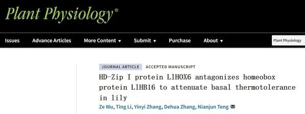 近日,ios版雷竞技官网园艺学院滕年军教授团队在Plant Physiology在线发表了题为“HD-Zip I protein LlHOX6 antagonizes homeobox protein LlHB16 to attenuate basal thermotolerance in lily”的研究论文,揭示了两个HD-Zip I转录因子LlHOX6和LlHB16拮抗调控核心的热响应因子LlHSFA2和LlMBF1c的表达参与百合耐热性建立的机制。