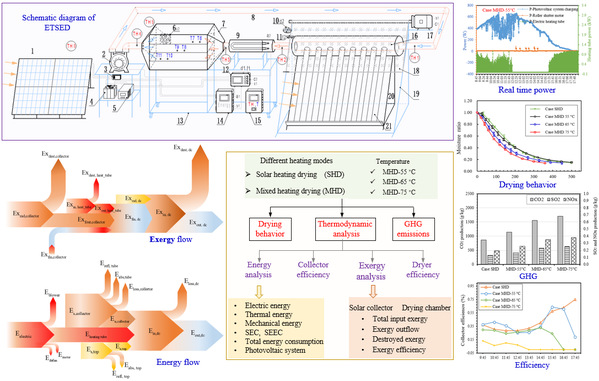 该团队首先开发了一款具有过程能量识别、物性状态实时感知及反馈调控的真空管太阳能多能互补干燥装备,随后系统性地探究了太阳能混合干制加工过程的干燥动力学、温室气体排放量(CO2、SO2、NOX)和热力学变化等内容。其中热力学分析包含热力学第一定律下系统各部件实时能量(energy)流向和占比情况,热力学第二定律下能量质量(㶲,exergy)的变化情况,干燥机效率和集热器效率等。结果表明该设备能有效减少碳足迹,具有良好的热力学性能;此外,系统集成的过程能量识别和物性分析等技术将促使干制行业精准节能调控策略的制定。该研究结果有助于降低食品加工业对化石燃料依赖的同时进一步确保粮食安全。我校食品院肖红梅教授和王辉副教授为本文的通讯作者。