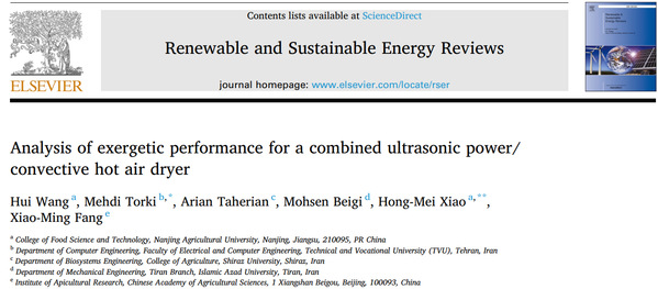 该论文对超声辅助热风对流干燥系统的加工性能和热力学特性进行了探究,具体探究了不同混合干制模式下干燥行为、加工效率和流体㶲的变化,并从能量数量、能量质量和环境足迹的角度对采用非热技术提高热风干燥设备性能的有效性进行了证明,同时提供了非热辅助对流干燥绿色加工调控策略的依据。我校食品院肖红梅教授为本文的通讯作者,我校食品院王辉副教授为本文的第一作者。