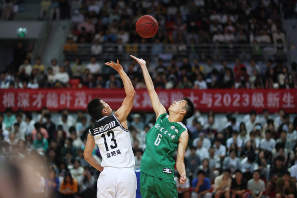 比赛中场,沈其荣与新生零距离互动示范,并将自己签名的篮球送出,现场氛围被推向高潮。一位新生大胆问道:“院士能教我投三分吗?”沈其荣院士笑着说:“授人以鱼不如授人以渔,我可以示范你一些基本的技巧,但是要靠你自己的练习才能领悟提高。”说着,他拿起篮球,走到三分线,向篮筐投去。球划过一道优美的弧线,准确地落入网中,引起全场欢呼。
