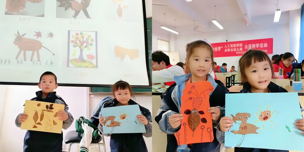 在“树叶承载的生命与植物世界的奇妙联系”小课堂中,志愿者们借助绘本和记录短片向孩子们介绍植物的有关知识,通俗易懂的讲解激发了孩子们的想象。小朋友们在志愿者的帮助下,不再拘谨,发挥奇思妙想,在彩色卡纸上拼贴树叶,感受落叶中存在的生命的力量,并制作落叶拼贴画。