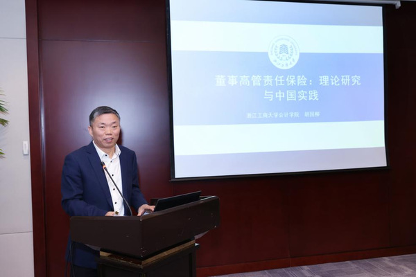 胡国柳教授作《董事高管责任保险:理论研究与中国实践》的报告。他介绍了董事高管责任保险的起源,从需求动因理论和治理效应两个维度阐释了理论基础,厘清了我国董事高管责任保险的法律法规和实践情况,并展开了深入研究。