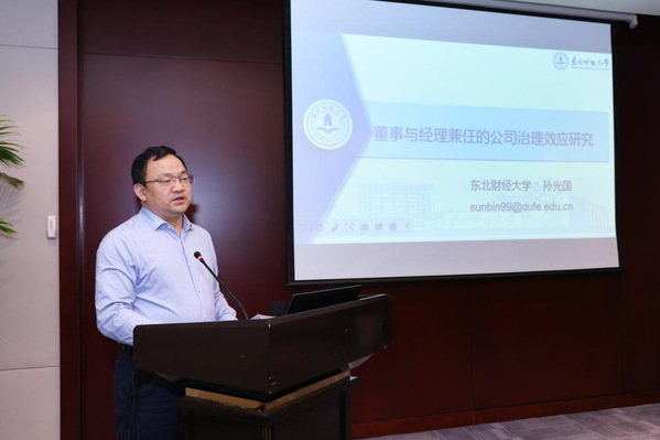 孙光国教授作《董事与经理兼任的公司治理效应研究》的报告。他介绍了董事与经理兼任的界定,从权责分析、政策背景、现实背景等方面对问题进行分析,以委托代理理论、现代管家理论、资本依赖理论为基础,详细阐释了相关研究成果。