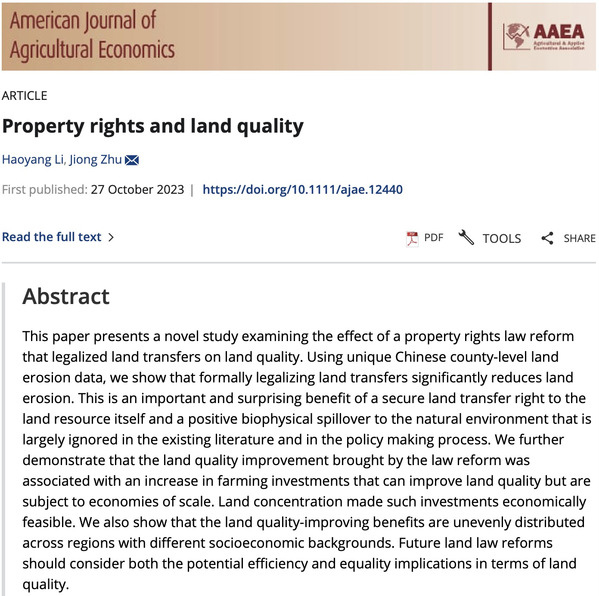 近日,我校经济管理学院李昊洋教授团队利用独特的中国县级土壤侵蚀数据探讨土地流转合法化这一产权制度安排对土地质量的影响。实证结果表明,土地流转合法化显著减少了土壤侵蚀。相关研究成果“Property Rights and Land Quality”在农业经济学国际顶刊American Journal of Agricultural Economics上发表。