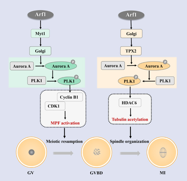 在本研究中,作者发现Arf1在卵母细胞中持续表达,并在减数分裂周期中富集于微管。通过siRNA敲低与外源mRNA挽救手段,发现Arf1缺失导致卵母细胞G2/M转换失败和极体排出失败。在此基础上作者检测了相关周期蛋白的表达水平,发现Arf1缺失导致蛋白激酶Myt1表达上调,而Cyclin B1累积失败、CDK1活性降低,通过注射Myt1 siRNA能部分挽救Arf1缺失导致的减数分裂恢复失败。同时,Arf1缺失导致高尔基体解链失败,基于GM130和Rab35的囊泡运输异常。此外,作者发现在第一次减数分裂中期Arf1缺失的卵母细胞呈现纺锤体形态异常,质谱分析及后续验证实验表明Arf1与Ran GTPase相关,通过影响纺锤体组装因子TPX2的表达,进而调控Aurora A与Plk1,引起磷酸化水平下降,参与卵母细胞减数分裂纺锤体组装,并影响微管稳定性,而外源Aurora A补充表达可有效挽救纺锤体组装缺陷。