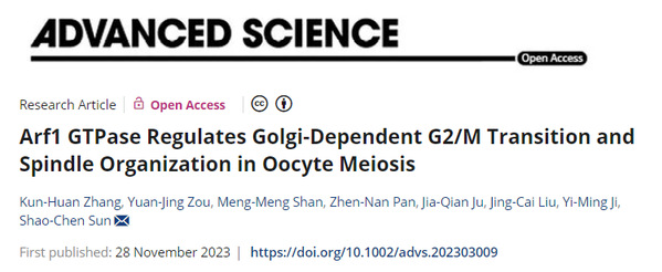 11月28日,ios版雷竞技官网孙少琛教授团队在Advanced Science期刊发表了题为:Arf1GTPase regulates Golgi-dependent G2/M transition and spindle organization in oocyte meiosis 的研究论文。该研究解析了小GTP酶Arf1在卵母细胞成熟过程对减数分裂恢复(G2/M转换)以及纺锤体组装的重要功能。
