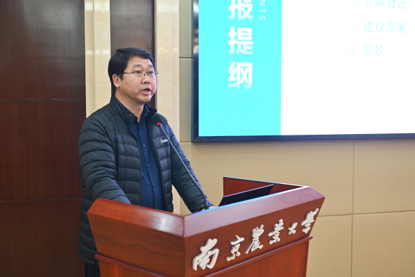 农学院副院长赵晋铭、盱眙县黄花塘镇党委书记张娟分别作国家大豆生物育种产教融合创新平台介绍以及盱眙基地选址情况介绍。