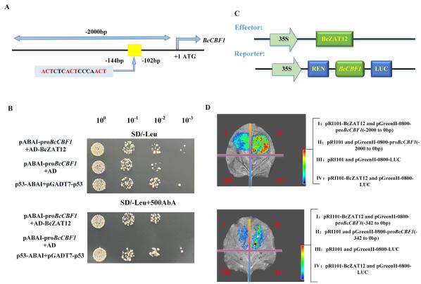 (2)筛选到了BcZAT12的互作蛋白BcABF2和BcABF4(图4),上游基因BcNTL4/BcNAC055(图5)以及下游基因BcCBF1(图6)。