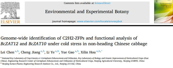 近日,ENVIRONMENTAL AND EXPERIMENTAL BOTANY在线发表了ios版雷竞技官网侯喜林教授团队题为“Genome-wide identification of C2H2-ZFPs and functional analysis of BcZAT12and BcZAT10under cold stress in non-heading Chinese cabbage/不结球白菜C2H2-ZFPs的全基因组鉴定及冷胁迫下BcZAT12和BcZAT10的功能分析”的研究论文。