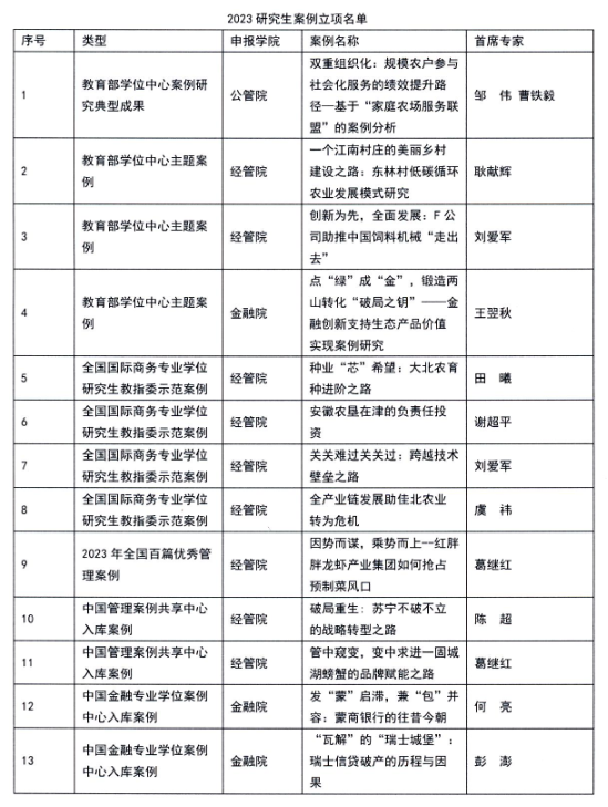 2023年,学校研究生优质教学建设成果丰硕。在课程建设方面,1门课程获评江苏省研究生课程思政示范课程,10门分别获批全国农业专业教指委、全国公共管理专业教指委、全国兽医专业教指委在线示范课程立项。在案例建设方面,1项成果入选教育部学位中心案例研究典型成果,3项案例获批教育部学位中心主题案例立项,9项案例入选全国各专业学位教指委案例库。