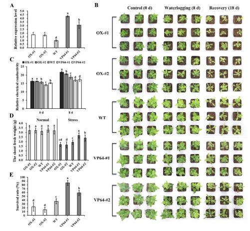 该研究发现,CmERF4受涝渍胁迫诱导上调表达,属于ERFVIIIa亚家族,具有转录抑制活性。过表达该基因降低了菊花的耐涝性,而CmERF4-VP64转基因株系的耐涝性显著增强,这说明CmERF4负调控菊花的耐涝性(图1)。