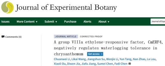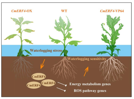 近日,我校菊花遗传育种团队在权威杂志Journal of Experimental Botany在线发表了题为“A group VIIIa ethylene-responsive factor, CmERF4, negatively regulates waterlogging tolerance in chrysanthemum”的研究论文,揭示了菊花转录抑制因子CmERF4通过介导能量代谢和活性氧路径相关基因,负调控菊花耐涝性。