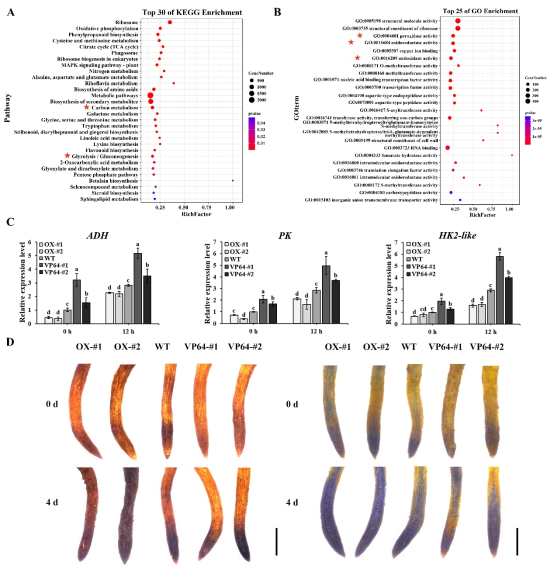 对转基因菊花株系的转录组分析和生理指标测定表明,CmERF4影响了能量代谢相关基因(ADH、PK和HK2-like)和活性氧相关基因(POD20、POD1-like和CAT-like)的表达(图2)。