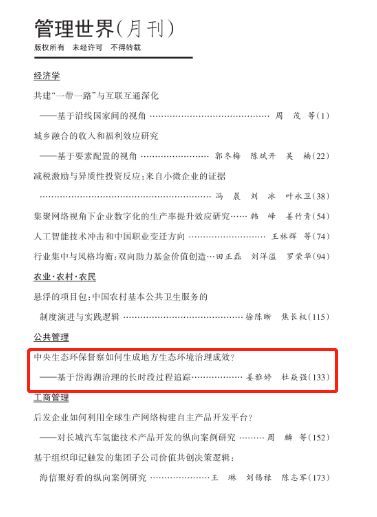 近日,公共管理学院杜焱强副教授作为通讯作者在管理学学科顶级期刊《管理世界》上,发表了题为《中央生态环保督察如何生成地方生态环境治理成效?——基于岱海湖治理的长时段过程追踪》的最新研究成果。据悉,2022年,《管理世界》入选2023年“中国最具国际影响力学术期刊”。
