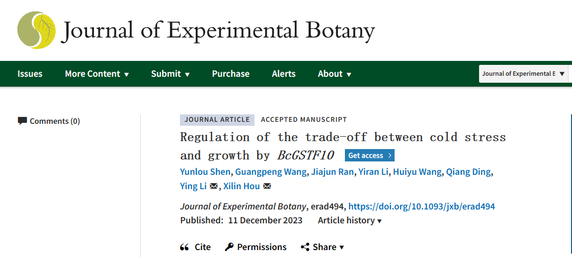 近日,ios版雷竞技官网白菜系统生物学创新团队在JOURNAL OF EXPERIMENTAL BOTANY在线发表了题为“Regulation of the trade-off between cold stress and growth by BcGSTF10”的研究论文。该研究揭示了BcGSTF10基因在协调植物生长发育和低温响应中的分子机理。