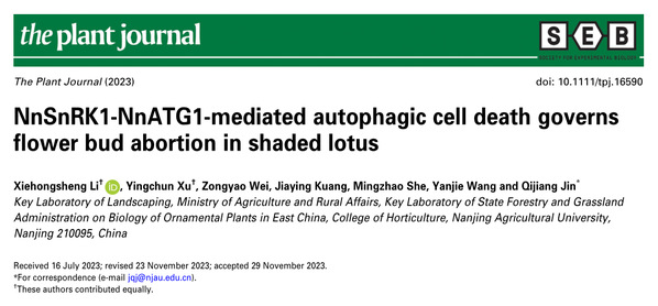 近日,园艺学院徐迎春教授团队在国际知名期刊《The Plant Journal》上发表了题为“NnSnRK1-NnATG1-mediated autophagic cell death governs flower bud abortion in shaded lotus”的论文。该研究揭示了自噬在植物繁殖过程中的重要调控作用,特别是在能量限制条件下,通过自噬调节开花过程,以提高植物的繁殖效率和能量利用效率,为理解植物如何在逆境下调整其生殖策略提供了新的视角。
