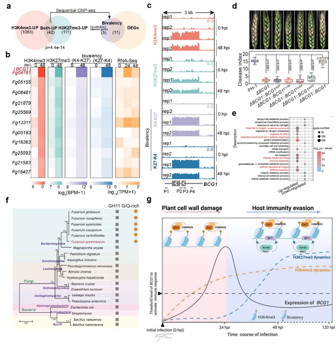 图2.(a-b)赤霉病菌侵染小麦过程中二价组蛋白修饰(H3K4me3-H3K27me3)调控关键致病基因表达;(c)赤霉病菌侵染小麦后BCG1二价组蛋白修饰水平显著升高;(d)新型木聚糖酶BCG1是赤霉病菌关键致病因子;(e)BCG1诱发小麦免疫;(f)BCG1的G/Q-rich motif仅存在于致病镰刀菌属中;(g)二价组蛋白修饰介导赤霉病菌免疫逃逸。