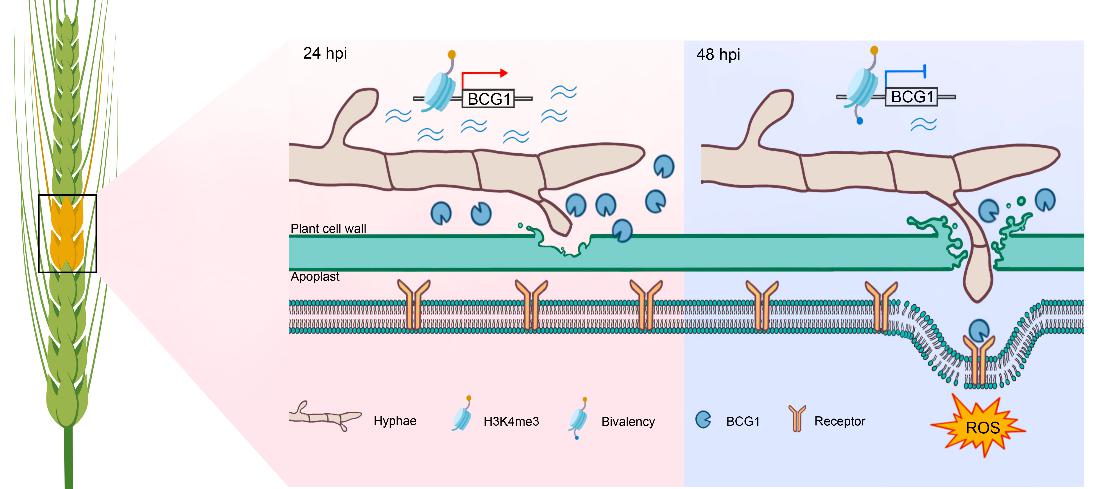 近年来,由于气候变化、大面积小麦/玉米轮作和秸秆还田等因素的影响,赤霉病在我国呈加重发生态势,严重影响小麦产量和品质,但目前赤霉病菌如何突破寄主屏障、逃逸寄主免疫的分子机制还不清楚。本研究中,作者通过对赤霉病菌侵染小麦过程中二价组蛋白修饰图谱的绘制,鉴定到16个二价组蛋白修饰所调控的关键致病基因(Bivalent-Chromatin Genes, BCGs),其中新型木聚糖酶BCG1能够帮助赤霉病菌降解植物细胞壁,进而侵入寄主。进一步研究发现BCG1仅存在于致病镰刀菌属中,其C端含有甘氨酸/谷氨酰胺富集序列(G/Q-rich motif),该序列的缺失导致BCG1的木聚糖酶活性及毒力显著减弱。有趣的是,作者发现 G/Q-rich motif还会被寄主的免疫识别受体识别触发植物免疫。为此,赤霉病菌进化出二价组蛋白修饰介导的“油门-刹车”机制,即在侵染前期利用H3K4me3修饰激活BCG1表达降解寄主细胞壁(油门);在突破细胞壁屏障后,为避免植物免疫系统识别,病菌对BCG1进行二价组蛋白修饰(H3K4me3-H3K27me3),抑制BCG1的表达(转录“刹车”),进而逃逸寄主免疫,帮助病菌成功侵染。