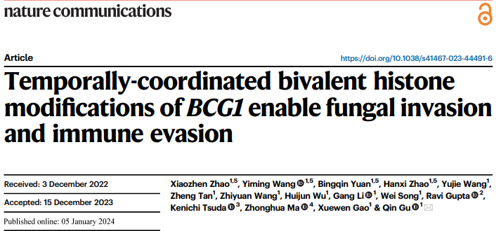 1月5日,植物保护学院高学文教授团队在《Nature Communications》上发表题为“Temporally-coordinated bivalent histone modifications of BCG1enable fungal invasion and immune evasion”的研究论文,揭示了植物病原真菌通过二价组蛋白修饰(bivalent histone modification)精细调控真菌基因转录,介导病菌逃逸寄主免疫从而成功侵染的表观遗传新机制。研究结果首次揭示了二价组蛋白修饰调控病原菌致病的分子机制,为基于表观遗传调控的赤霉病绿色防控技术研发提供理论基础。