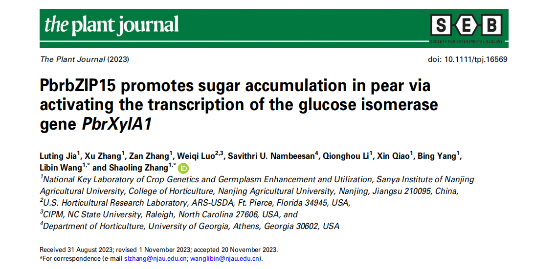 近日,张绍铃院士团队在国际期刊The Plant Journal发表了题为“PbrbZIP15 promotes sugar accumulation in pear via activating the transcription of the glucose isomerase gene PbrXylA1”的文章,首次揭示了PbrbZIP15-PbrXylA1通过葡萄糖异构途径促进梨果实糖分积累的调控机制。