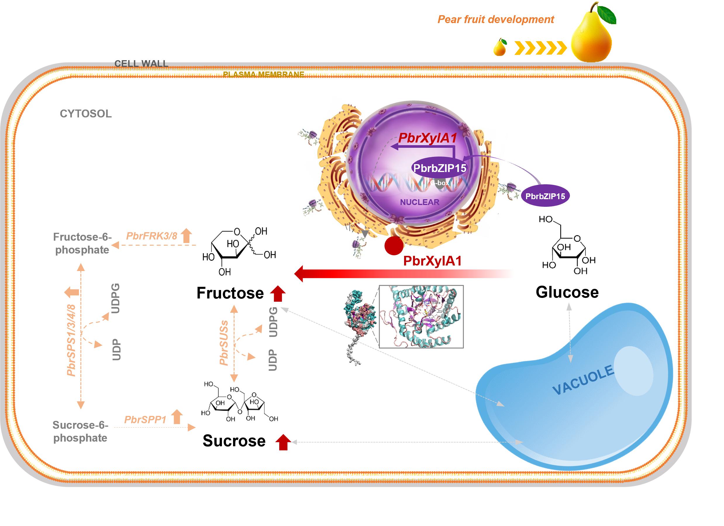 综上得出,PbrbZIP15可激活PbrXylA1的转录,从而通过葡萄糖异构途径,提升梨中果糖含量,并促进蔗糖与总糖积累水平,进而提升果实甜度。该研究为解析梨果实糖分积累机制提供了新见解,拓宽了梨果实糖代谢调控网络。同时,本研究首次证明了园艺果实存在葡萄糖与果糖的相互异构过程。