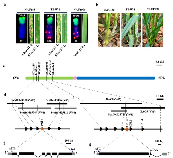 作物对病原菌抗性具有多样性,如生育期依赖抗性、组织特异依赖抗性及温度依赖抗性等。尽管已克隆大量作物抗病基因,但对不同类型抗性的分子遗传机制还知之甚少。本研究团队前期利用不同来源簇毛麦(Dasypyrum villosum,2n=2x=14, VV),创制了分别携带抗白粉病基因Pm55和Pm5V的T5DL·5VS易位系,研究发现携带Pm55基因的T5DL·5VS易位系5叶期后表现高抗,成株期基部叶鞘感病,其它组织部位高抗,是生育期和组织依赖抗性类型。而携带Pm5V基因的T5DL·5VS易位系全生育期和所有组织均高抗白粉病。利用这两个不同来源T5DL·5VS易位系构建遗传分离群体,结合染色体分拣测序和BAC测序,图位克隆了Pm55和Pm5V基因,发现二者为等位基因,编码CC-NBS-LRR蛋白,分别重新命名为Pm55a和Pm55b(图1)。