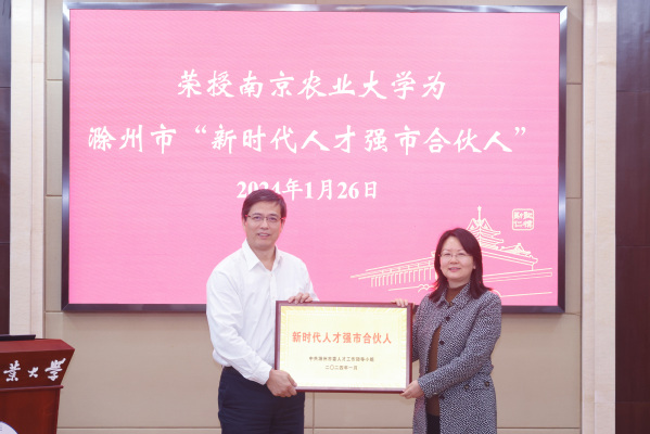 会上,王源超、周文芳代表校地共同为滁州市“新时代人才强市合伙人”进行接授牌。滁州市政府秘书长、人社局局长罗圣权介绍了滁州市人才情况。同时,我校进行了《滁州科教创新园规划建设进展》《滁州研究院筹建方案》《宁香粳9号协同生产技术》和《特种水产养殖技术推广》等专项交流汇报。