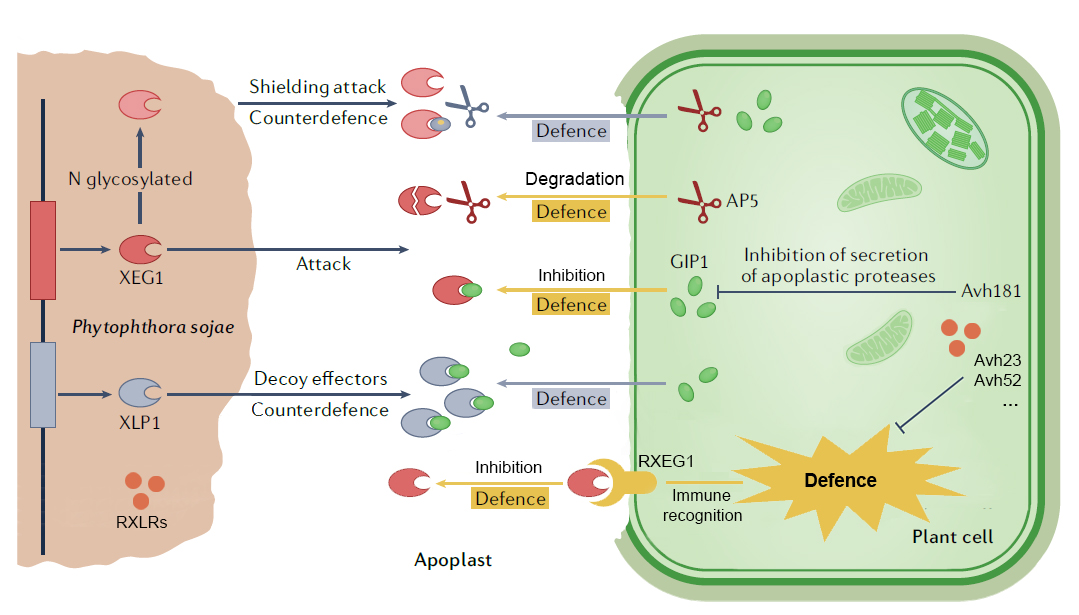 细胞壁由高度复杂的纤维素、半纤维素、果胶聚糖结构组成,是病原菌成功入侵植物需要突破的重要防线。王源超教授团队在前期的研究中发现围绕细胞壁半纤维素,疫霉菌和植物进行着复杂的多重分子博弈。在侵染植物早期疫霉菌分泌的核心效应子糖基水解酶XEG1通过降解细胞壁半纤维素破坏植物抗病性(Ma et al., 2015 Plant Cell)。植物能分泌蛋白酶抑制子抑制XEG1的活性抵抗病原菌的侵染,但是在进化过程中,疫霉菌获得了XEG1的酶活丧失突变体XLP1,利用XLP1作为“分子诱饵”竞争性保护核心效应子XEG1免受植物蛋白酶抑制子GIP1的攻击,揭示了病原菌致病新机制“诱饵模式”(Ma et al., 2017 Science)。随后研究发现大豆疫霉通过N-糖基化修饰来保护XEG1免受植物胞外天冬氨酸蛋白酶GmAP5的降解(Xia et al., 2020 PNAS)。XEG1可被烟草、大豆、番茄等多种植物识别触发免疫反应(Ma et al., 2015 Plant Cell;Wang et al., 2022 JIPB)。为了解析XEG1的免疫识别机制,该团队成功鉴定到植物识别XEG1的免疫受体RXEG1(Wang et al., 2018 Nature Communications)。通过与柴继杰教授合作,解析识别受体RXEG1多种不同状态的结构并结合体内生化和功能分析,揭示了细胞膜受体蛋白具有“免疫识别受体”和酶活“抑制子”的双重功能(Sun et al., 2022 Nature)。以上研究揭示了病原菌与植物围绕核心效应子XEG1展开的多层次攻防博弈。将受体RXEG1转基因能提高多种作物对以效应子XEG1为致病因子的多种病原菌的广谱抗病性,为改造作物广谱抗性提供了重要的基因资源(Wang et al., 2023 PBJ)。