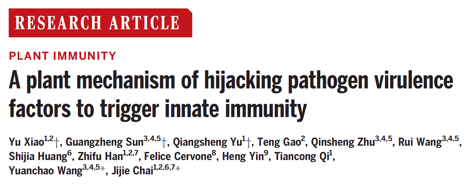 2月15日,我校王源超教授团队和清华大学/西湖大学柴继杰教授团队合作在国际权威学术期刊Science上发表了题为A plant mechanism of hijacking pathogen virulence factors to trigger innate immunity的研究论文,揭示了植物PGIP特异性识别病原菌PG并劫持其酶活性来触发植物先天免疫的独特分子机制,对认识植物免疫系统、合理利用和精准改造PGIP提高作物抗性具有重要的指导意义。