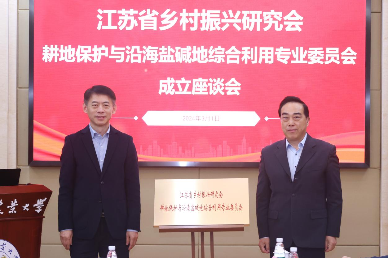 江苏省乡村振兴研究会常务副会长杨时云宣读了关于成立江苏省乡村振兴研究会耕地保护与沿海盐碱地综合利用专业委员会的决定,沈其荣院士受聘专业顾问,欧名豪教授受聘名誉主任,我校公共管理学院院长冯淑怡教授受聘主任委员。王春春和王荣平共同为专业委员会揭牌。
