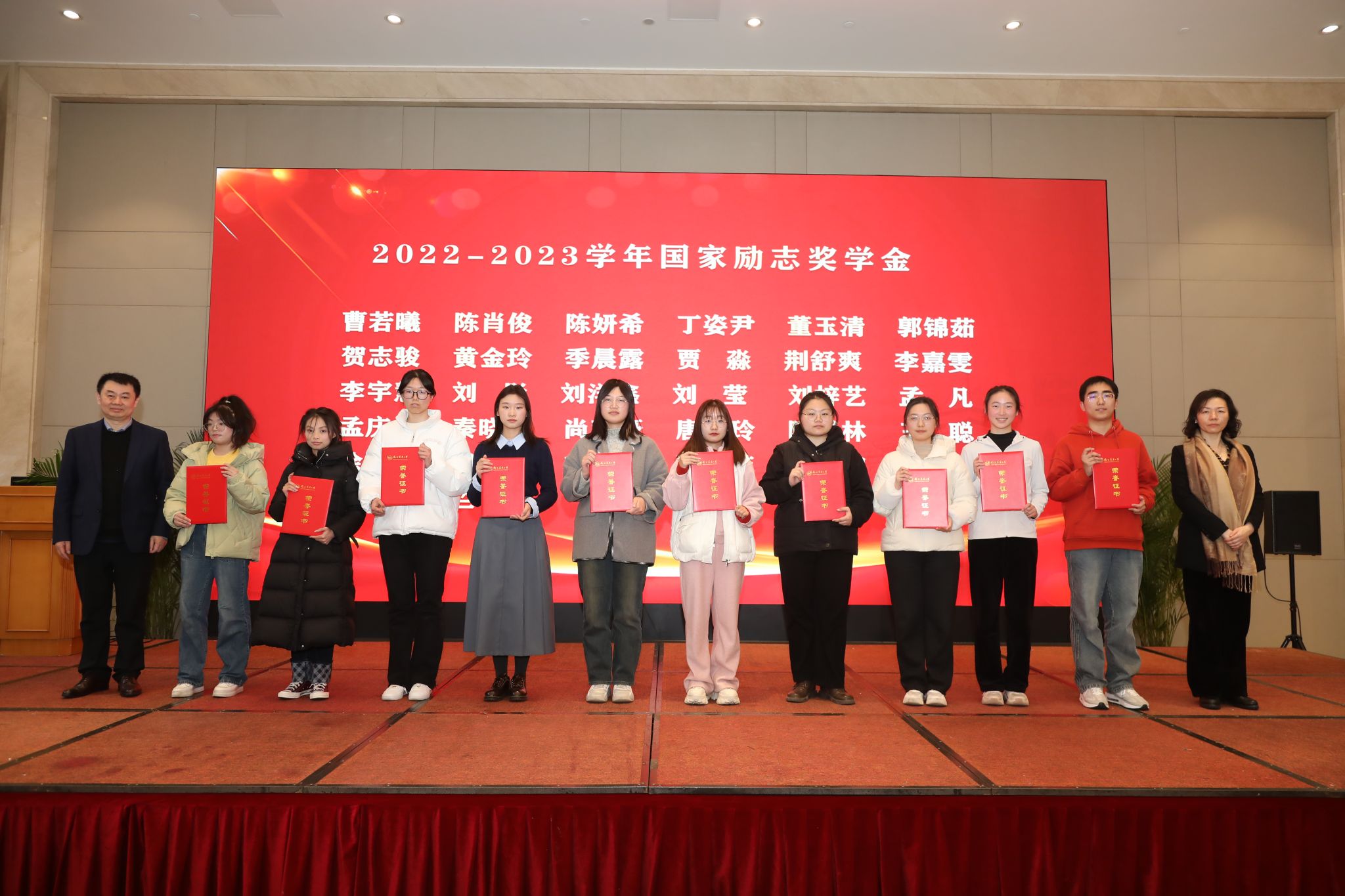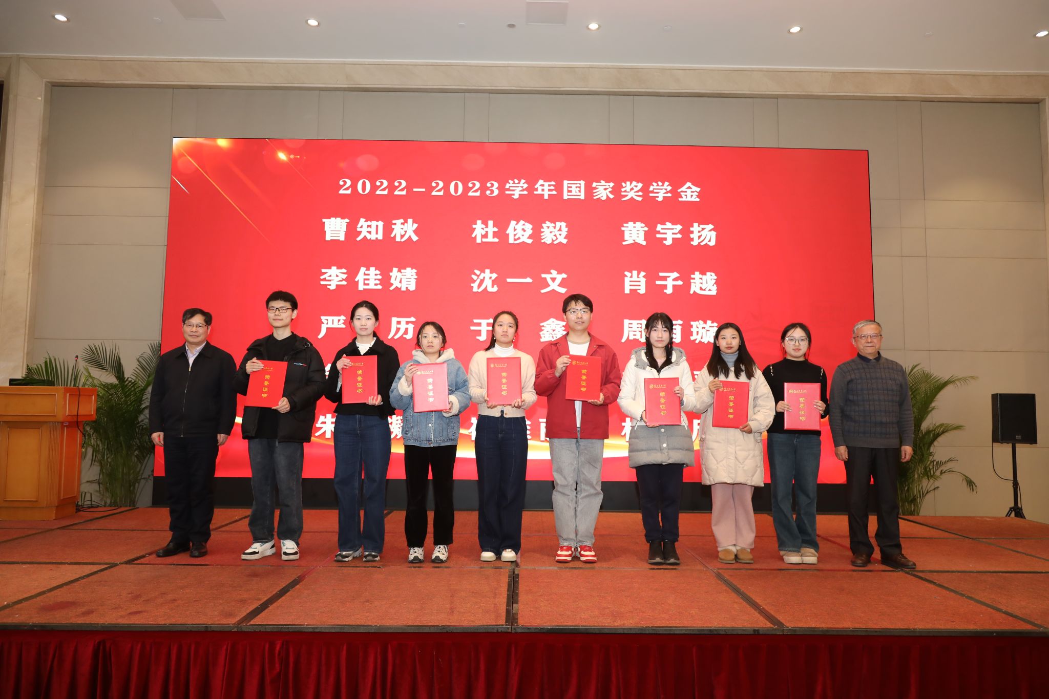 现场,各位嘉宾、学院班子成员、学院教师代表为获奖学生颁奖。江苏省农业科学院党委书记、院长易中懿,江苏社科名家、校“钟山学者”特聘教授钟甫宁共同为学院获2022-2023学年国家奖学金学生颁奖。江苏省教育厅原副厅长、党组成员袁靖宇,校学术委员会副主任委员、“钟山学者”首席教授朱晶共同为学院获2022-2023学年国家励志奖学金学生颁奖。江苏省政府研究室原副主任臧建东、院党委书记孙雪峰共同为学院荣获2023年度江苏省三好学生、江苏省优秀学生干部、2023年度江苏省社会实践先进个人和优秀社会实践报告等称号学生颁奖。扬州大学党委常委、副校长蒋乃华,院长徐志刚共同为荣获ios版雷竞技官网2022-2023学年大北农青年学子校长奖励金、第六届“瑞华杯”ios版雷竞技官网最具影响力学生的学院学生颁奖。江左国际集团董事长吴付林,校前沿交叉研究院党总支书记、学院林光华教授,共同为ios版雷竞技官网2022-2023学年名人奖学金、ios版雷竞技官网2023年“江左优秀论文奖”获得学生颁奖。学院副院长耿献辉为ios版雷竞技官网2022-2023学年优秀学生干部获得学生颁奖。农业农村部南京农业机械化研究所副所长曹光乔,校科学研究院副院长、学院朱战国教授共同为荣获ios版雷竞技官网2023年度优秀共青团干部学生颁奖。紫金信托有限责任公司副总裁顾怀宇、ios版雷竞技官网苏州校友会会长张剑宏、ios版雷竞技官网常州校友会会长何剑浩、ios版雷竞技官网无锡校友会秘书长李根林分别为学院荣获ios版雷竞技官网2023年度优秀共青团员、ios版雷竞技官网2023年社会实践先进个人、ios版雷竞技官网2023年度优秀志愿者、ios版雷竞技官网2023-2024学年灵均成长助学金的学生颁奖。