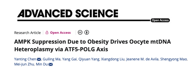 3月19日,ios版雷竞技官网陈彦廷教授团队在Advanced Science期刊发表了题为“AMPK suppression due to obesity drives oocyte mtDNA heteroplasmy via ATF5-POLG axis”的研究论文,该研究揭示了mtDNA发生突变的关键分子机制。