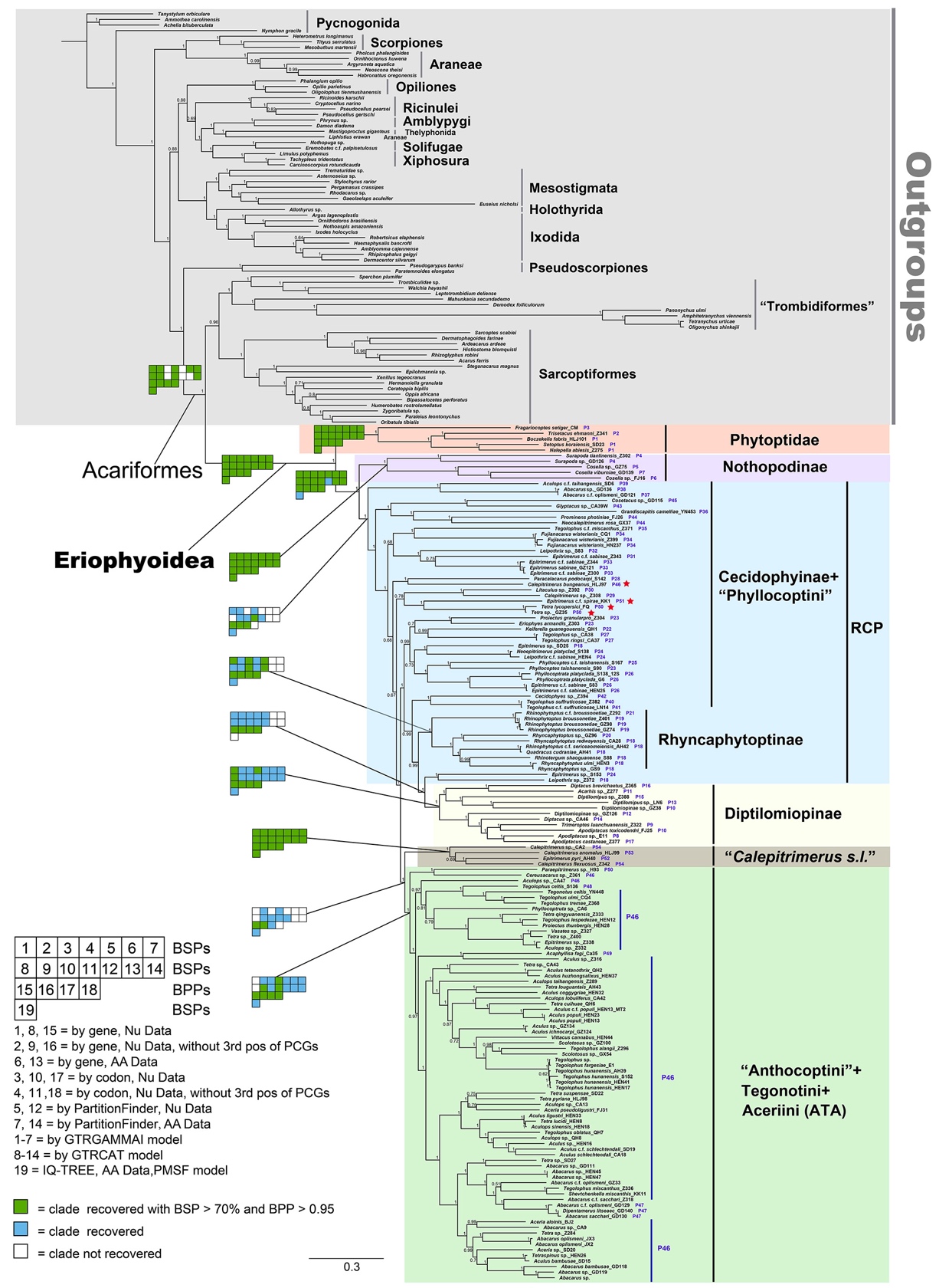 图2. 基于线粒体基因组核酸序列构建的瘿螨总科系统发育树