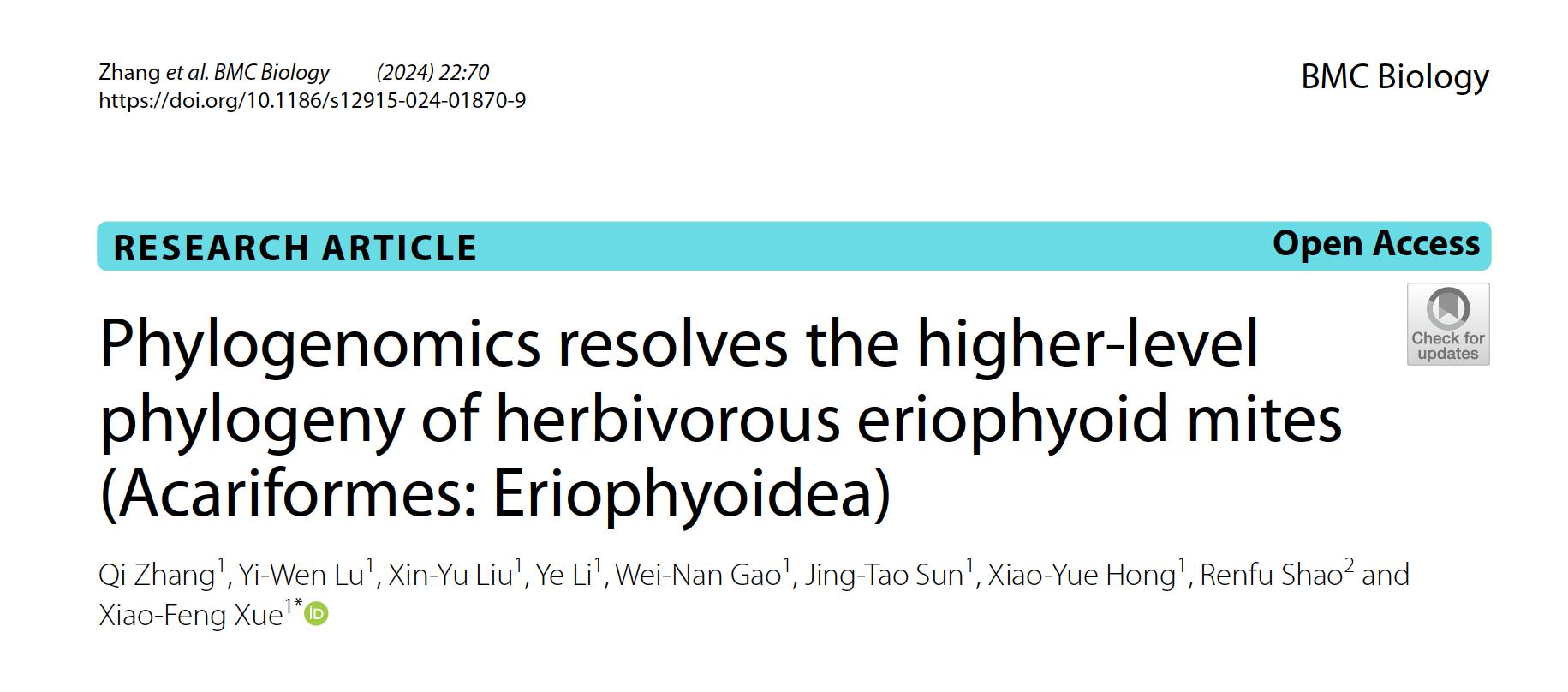 3月22日,植物保护学院洪晓月教授团队薛晓峰教授在生物学领域经典期刊《BMC Biology》上发表了题为“Phylogenomics resolves the higher-level phylogeny of herbivorous eriophyoid mites (Acariformes: Eriophyoidea)”研究论文。研究成果为瘿螨总科内部分类系统的构建提供了分子证据。