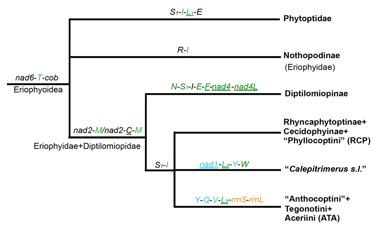 图1. 瘿螨总科高级分类阶元共享演化的线粒体基因簇图
