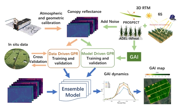 图1. 数据驱动、模型驱动和集成方法训练和验证小麦GAI估算模型。其中,三维冠层结构模型采用数字化植物表型平台D3P,三维辐射传输模型采用LESS。
