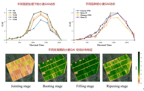 图3. 不同氮肥处理、不同品种小麦GAI主要生育期的田间GAI分布图。